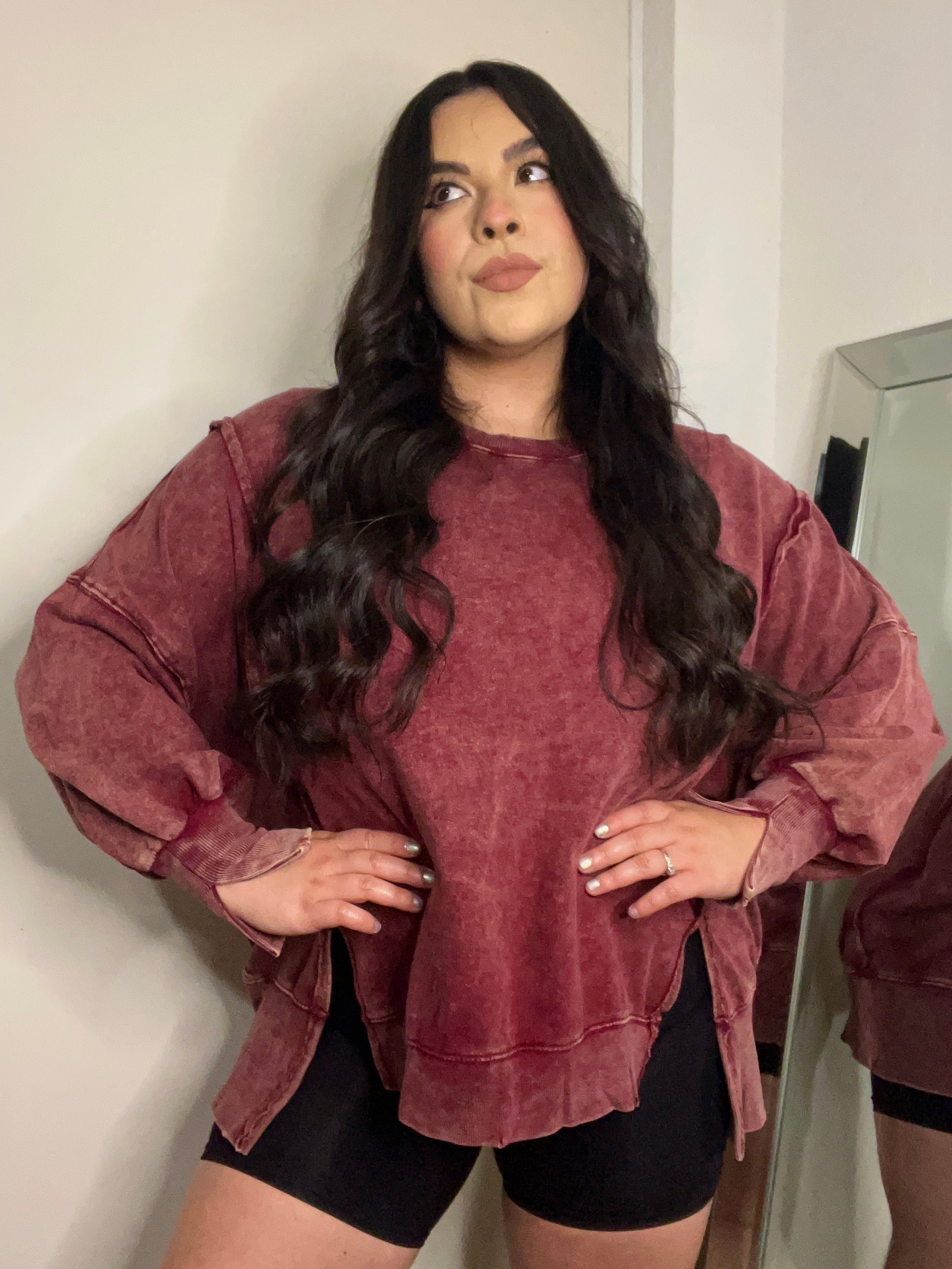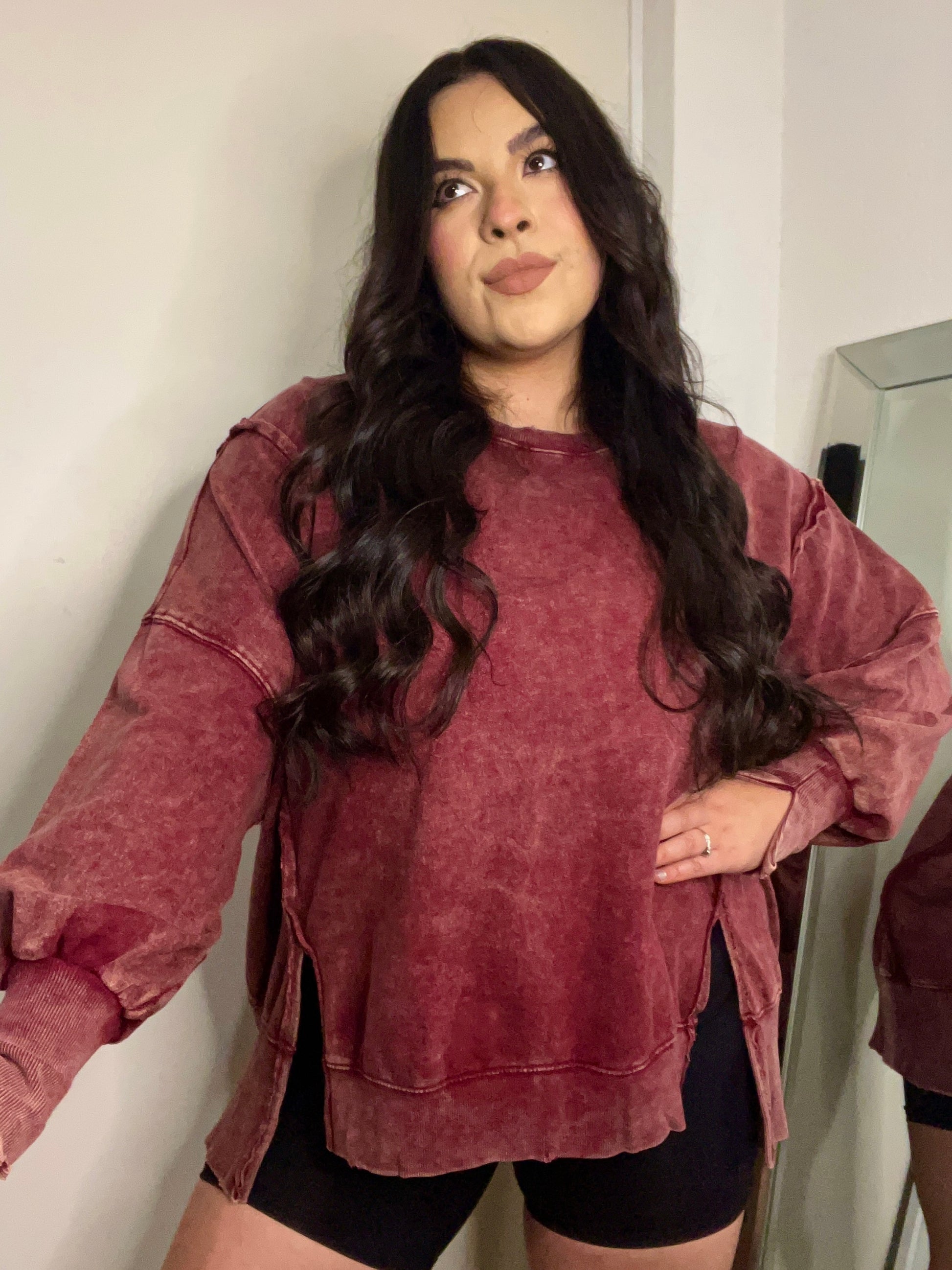 Stand out in this soft oversized French terry sweatshirt. Has a unique acid wash color way. Has exposed seam detailing with a high low hem.