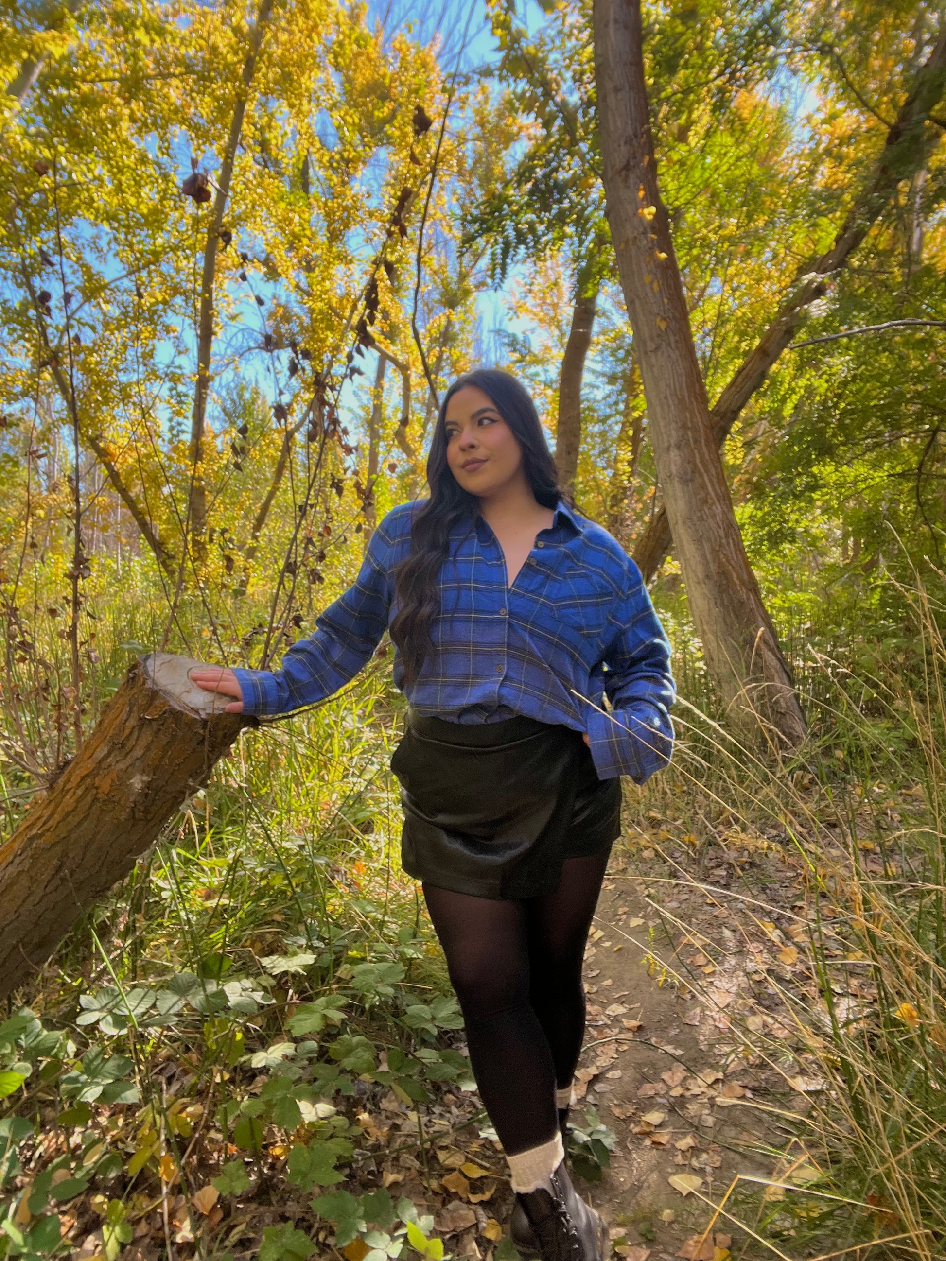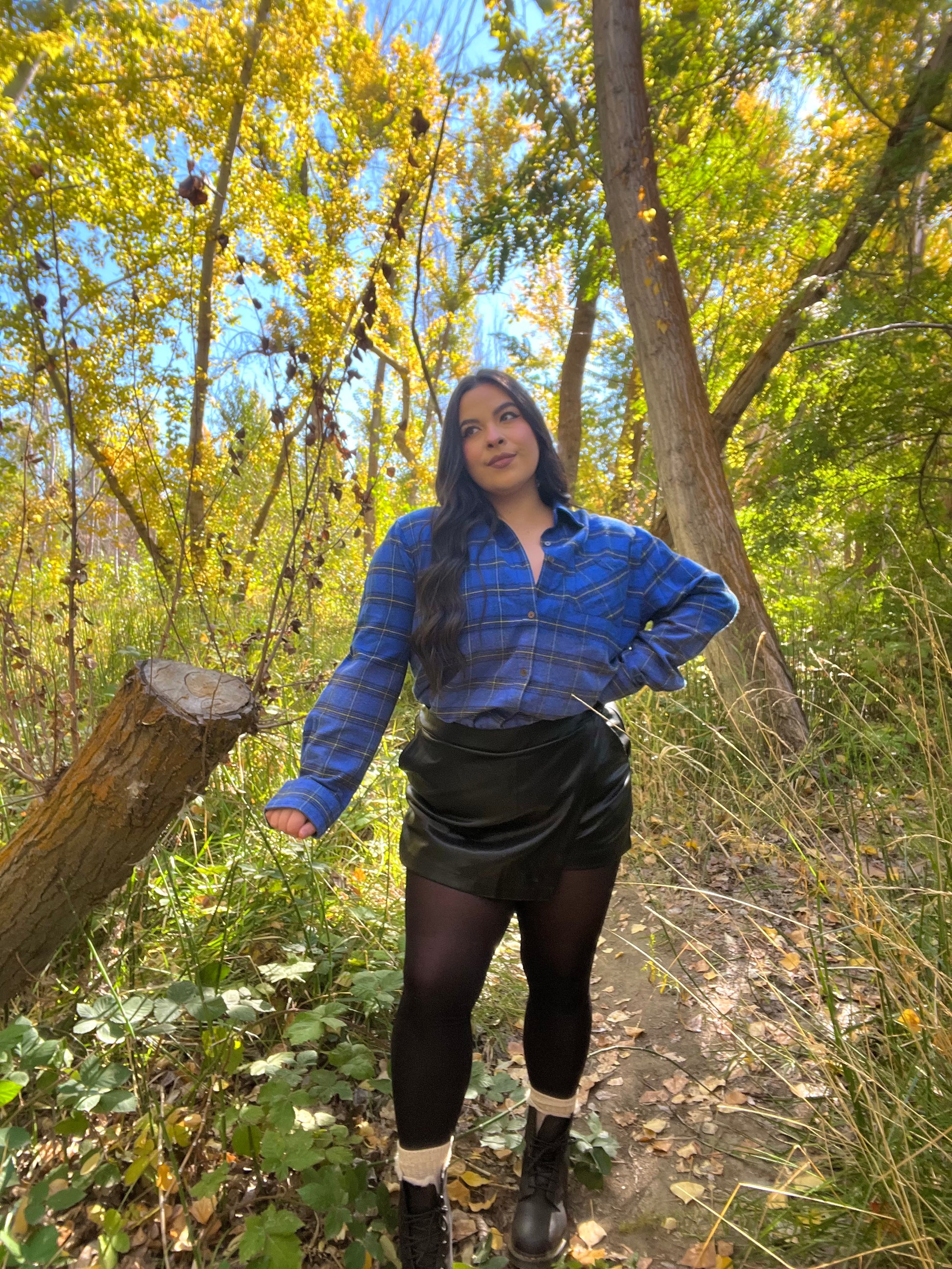 The perfect faux leather skort to elevate any outfit. Super soft & stretchy faux leather fabric. With an elastic waistband & soft fleece lining to ensure comfort. Has 2 functional front pockets. Perfect for all your fall, holiday, concert outfits.
